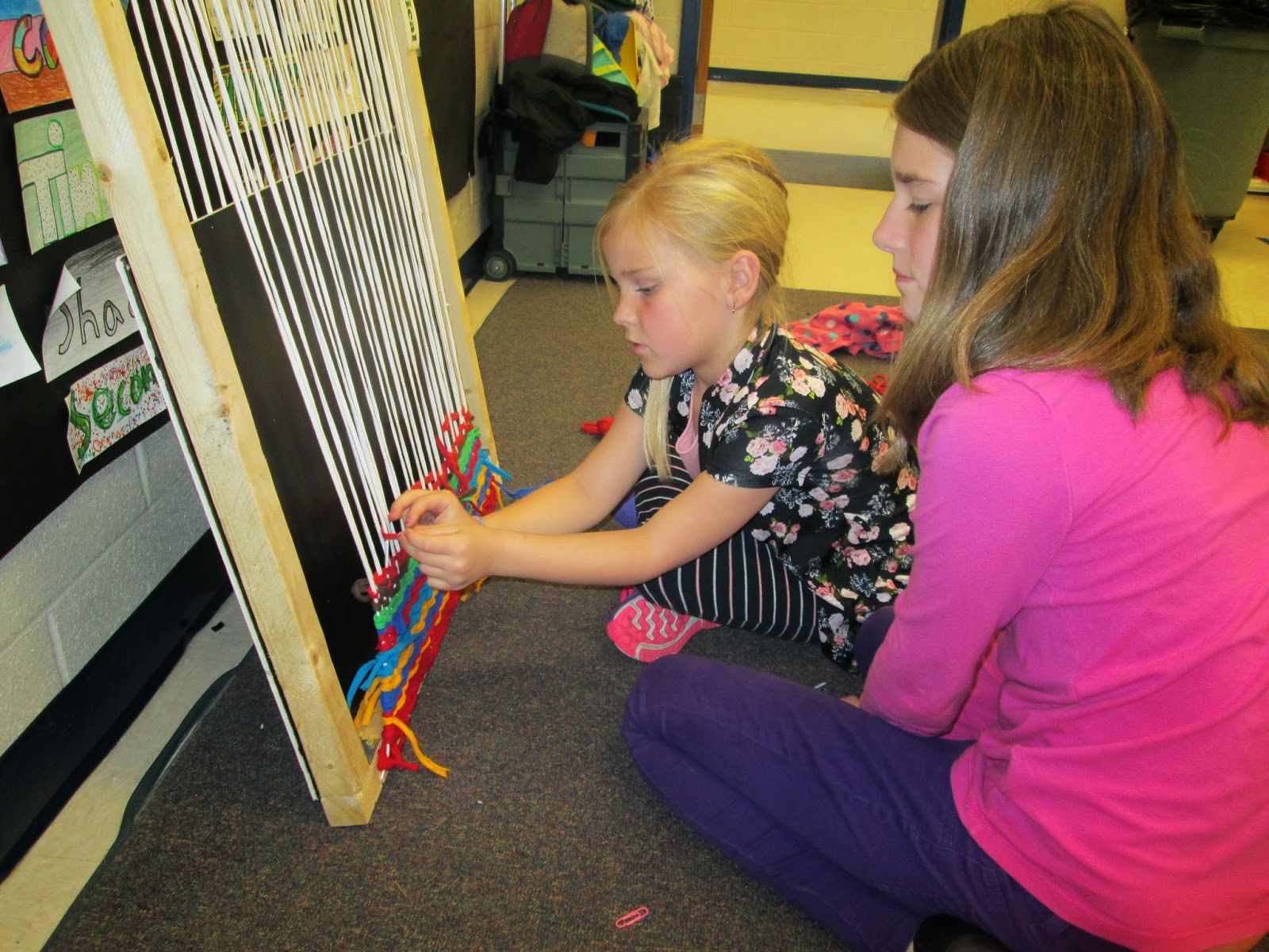 My art room has become a weaving wonderland! With lots of different groups tackling the lots of different fiber art projects this month, we have been unbe-weave-ably busy. Our 1st graders have just finished up their mini weavings this week and they were super successful! With the help of our 4th grade friends, we learned how to create a loom, wrap our warp strings (the up and down strings), and weave our weft stings (the right to left stings).